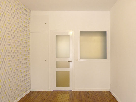 Un grand placard sur mesure, toute hauteur et toute largeur vient habiller la cloison entre l’entrée/cuisine, le séjour et la chambre. En plus des caissons de rangement en allège et imposte, le mobilier intègre deux portes de distribution en bois massif vitrées et un châssis vitré fixe, afin d’apporter de la lumière venant des fenêtres côté rue.